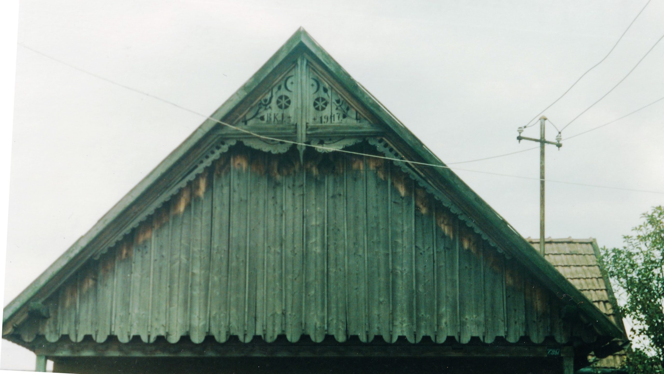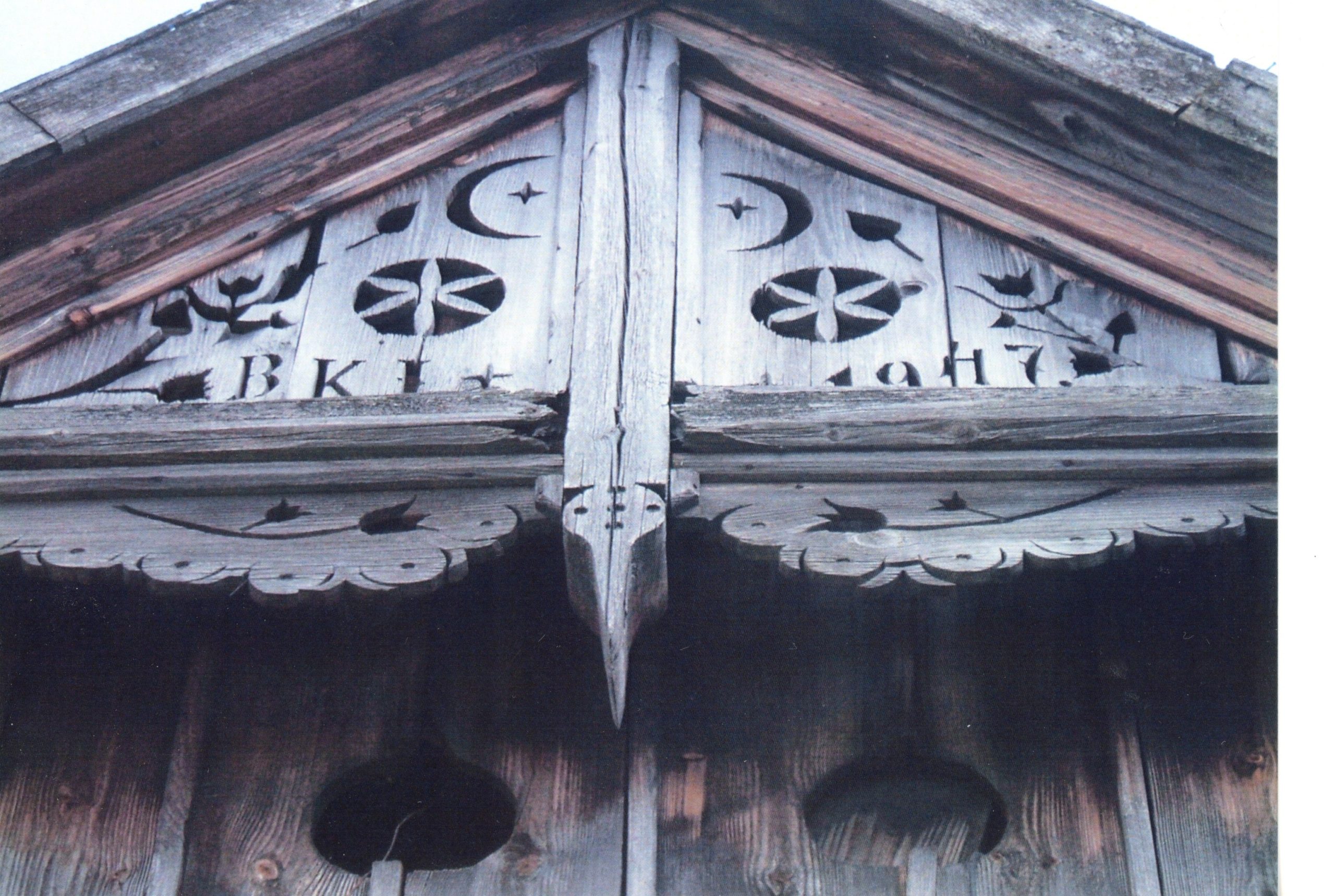 A tornácos házak utca felőli oldalán, néha az udvarra néző felén is a főbejárat felett, a tetőszerkezet felső háromszögében kapott helyet a bütü dísz. Gyergyóban a sátortetős ház rövidebb oldalát nevezik ház bütünek. Jelen esetben a BKI az építtető nevét rövidíti, évszámmal: 1947. Sajnos ma már nem létezik a ház. A fényképet Páll Gizella bocsátotta a szerkesztőség rendelkezésére. A rajzot Berszán-Árus Bence készítette.